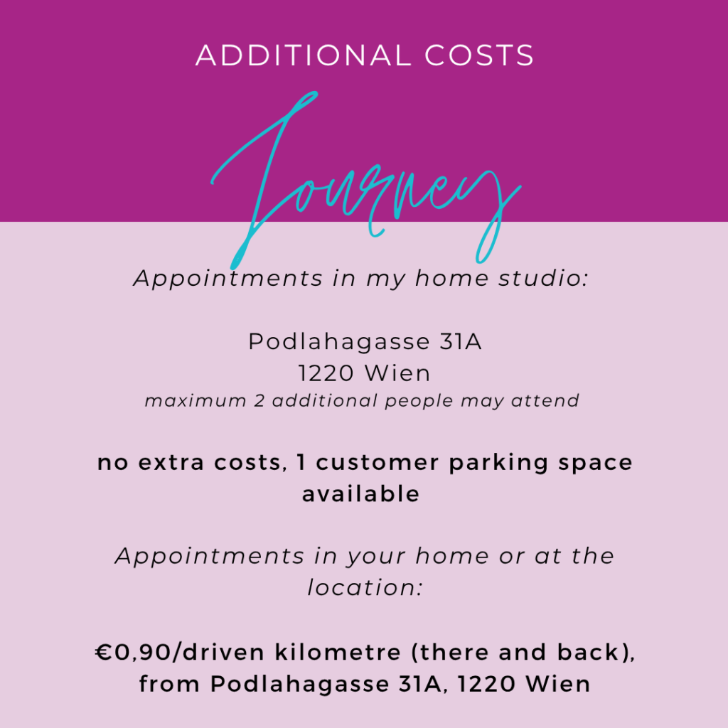 Appointments at your home of location have an additional cost of €0,90 per driven kilometer (there and back) from Podlahagasse 31A, 1220 Wien.