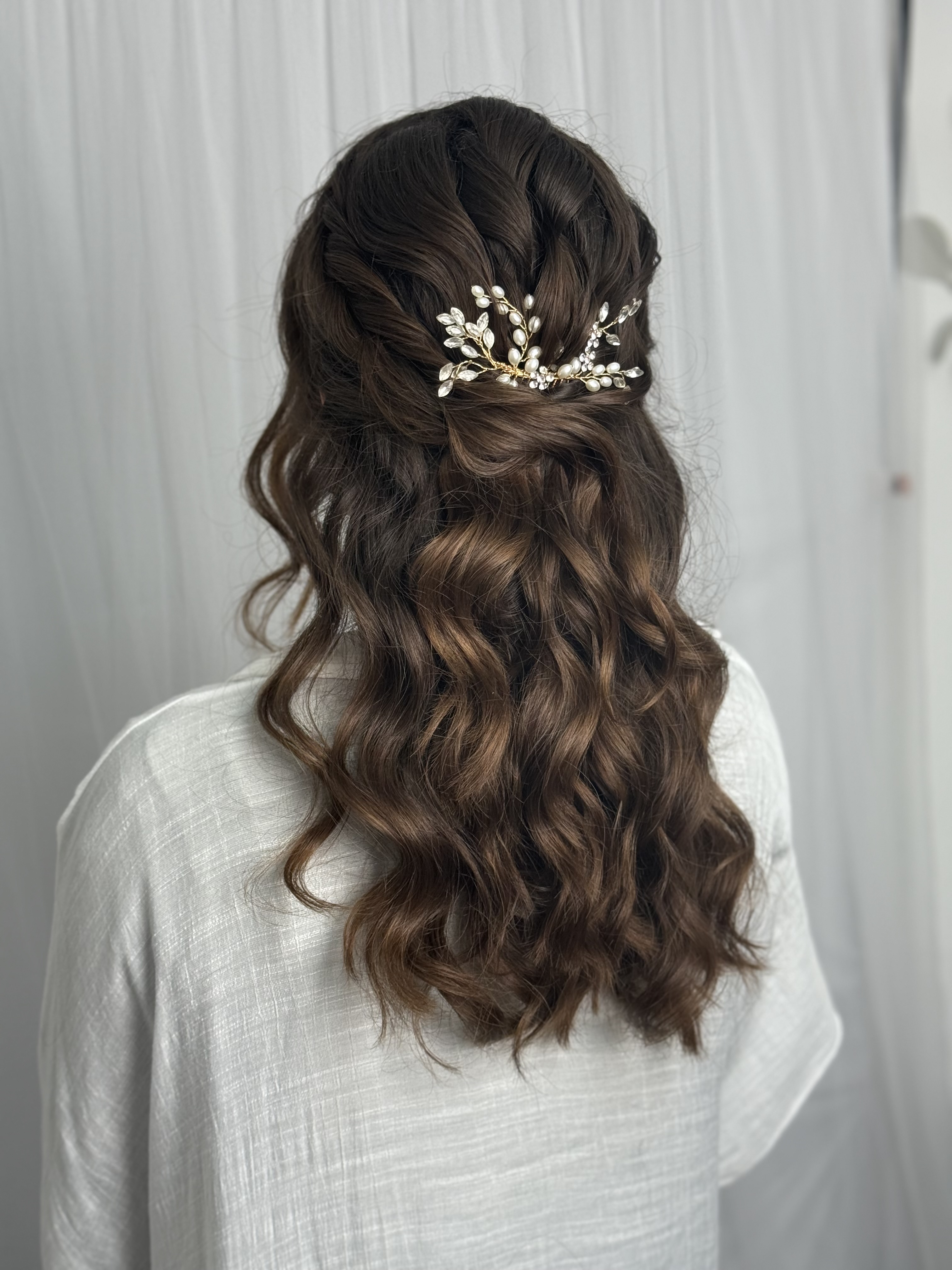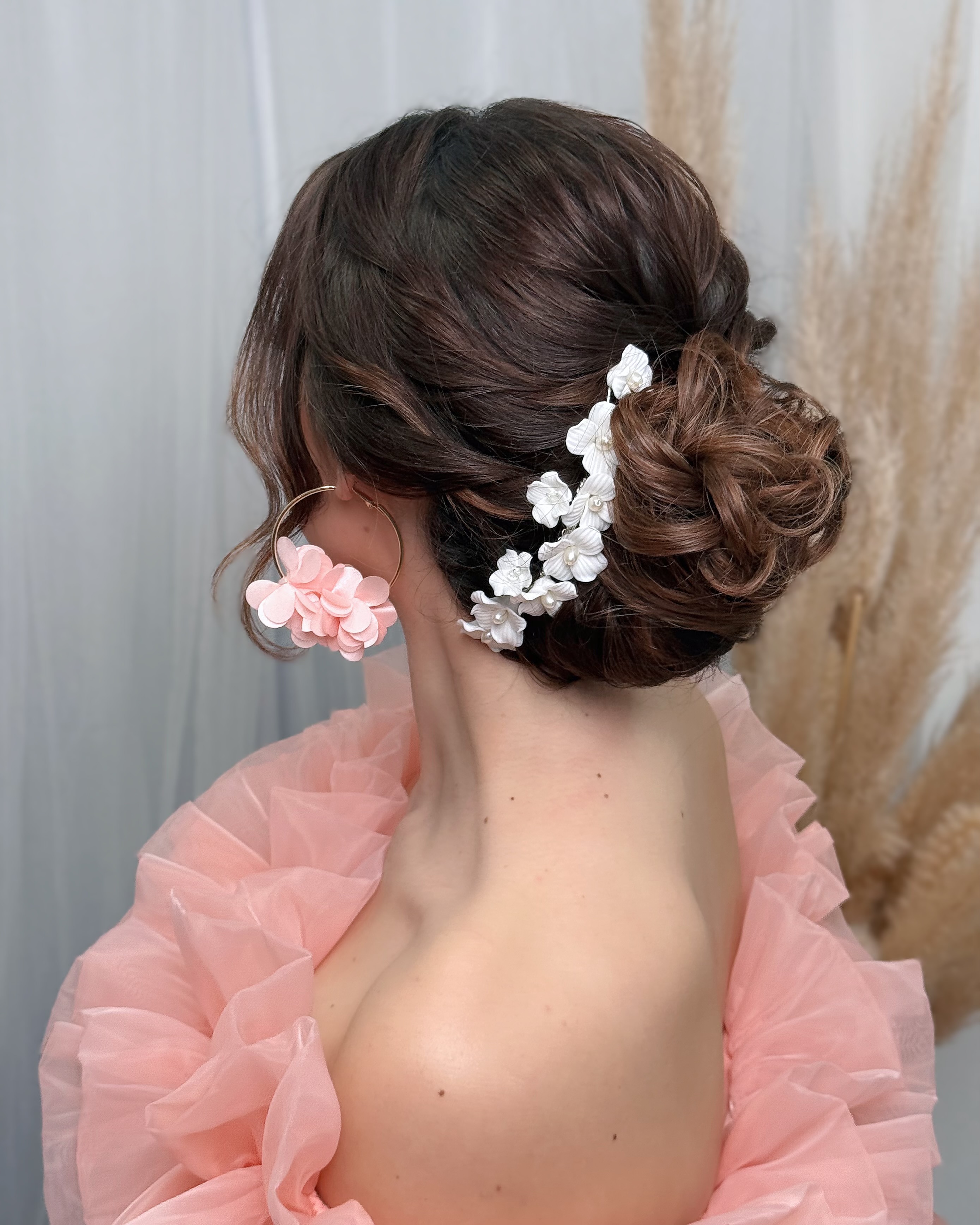 The day-of assistance includes my presence after the initial bridal styling, ensuring your look stays flawless with touch-ups throughout the day and providing support for an optional restyling in the evening.