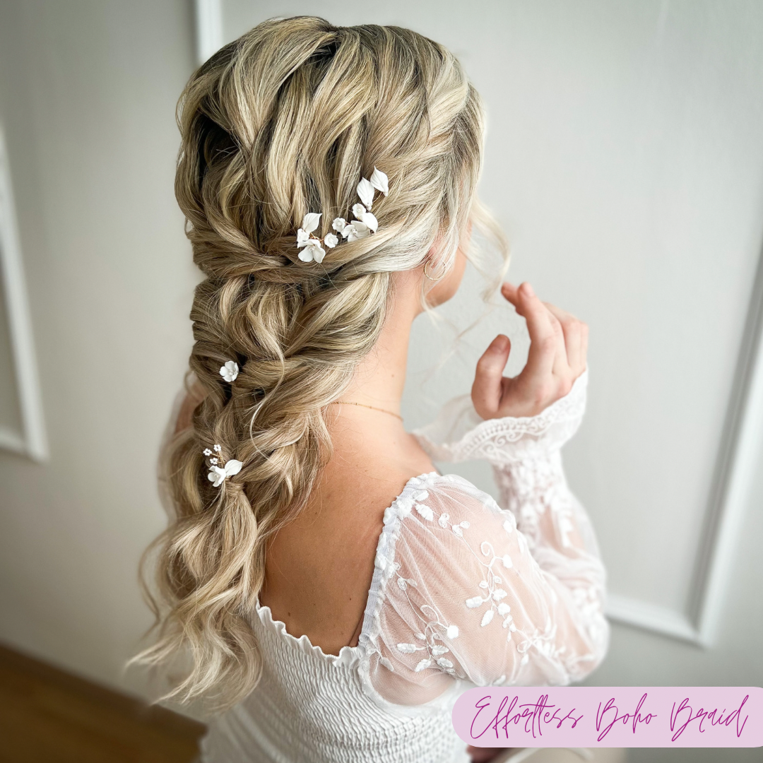 Der Mermaid Braid ist perfekt für Bräute, die einen verspielten, märchenhaften Look wünschen. Durch kleine, verspielte Strähnen entsteht eine weiche, voluminöse Flechtstruktur: wunderschön mit Blumen oder zarten Haarnadeln kombiniert.