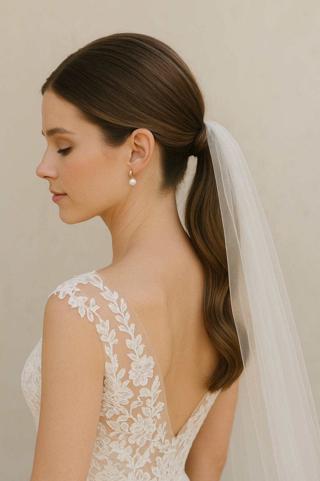 Ein Low Ponytail ist schlicht, aber unglaublich edel. Ob glatt oder leicht gewellt, mit einem kleinen Twist oder Accessoire – dieser Look passt hervorragend zu minimalistischen Hochzeitskleidern und modernen City-Weddings in Wien.
