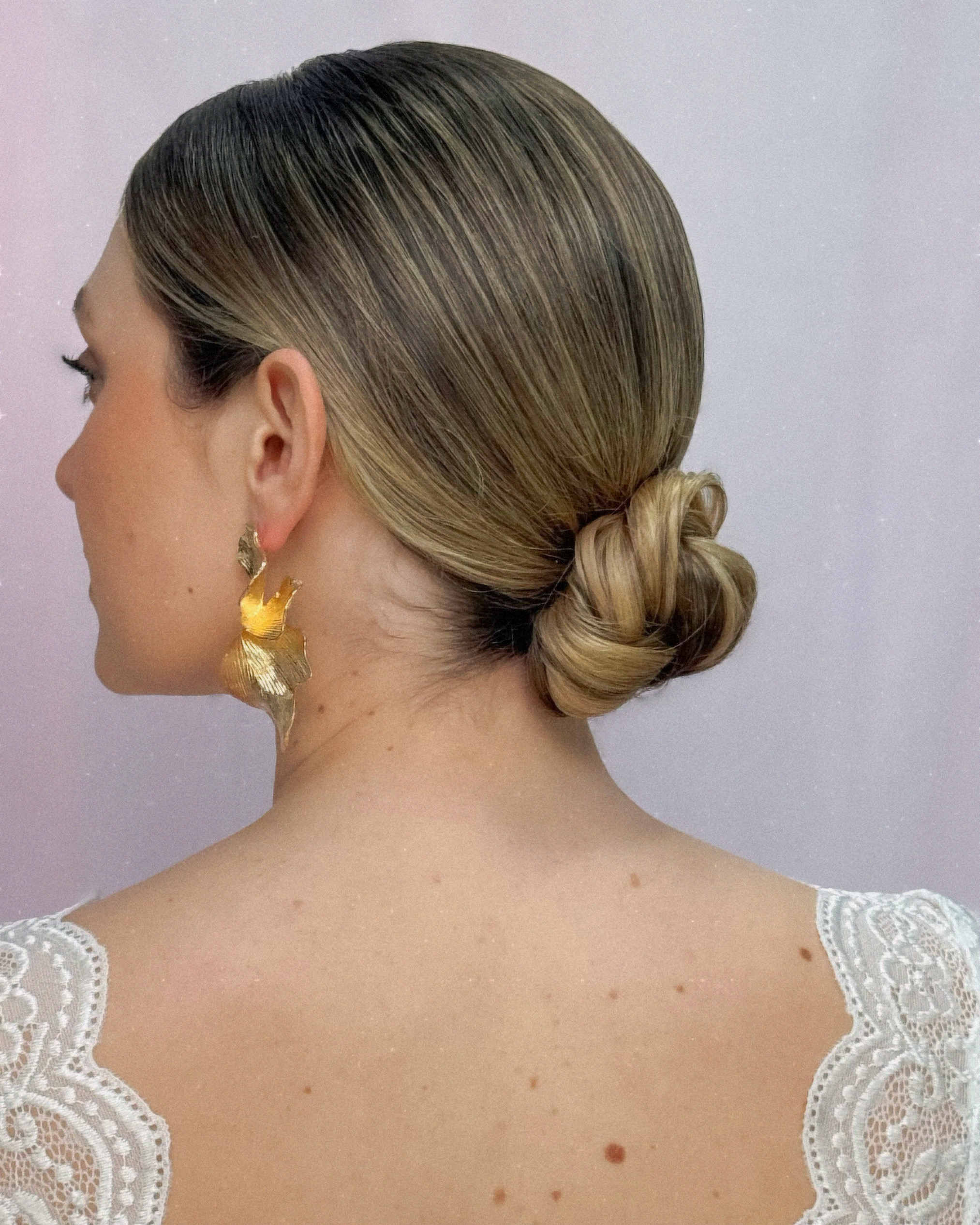 Ein Sleek Updo ist ideal für Bräute, die einen eleganten, zeitlosen Look lieben. Das Haar wird glatt und ordentlich hochgesteckt; perfekt zu einem cleanen, modernen Brautkleid.
