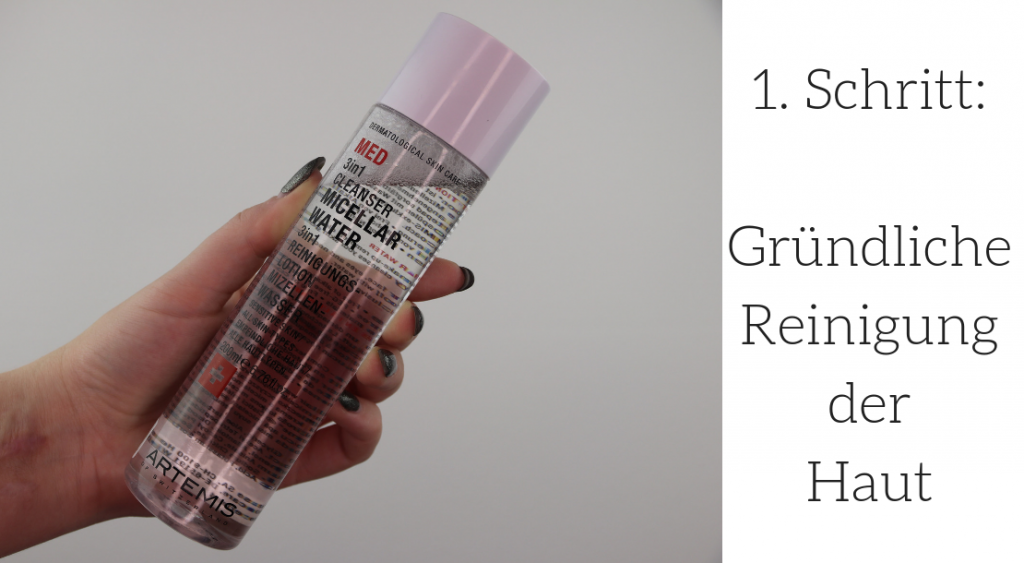- Verwendet ein gutes Mizellenwasser um die Haut ausgiebig zu reinigen und von Fett zu befreien. Ich kann das Artemis Med 3in1 Reinigungslotion Mizellenwasser sehr empfehlen. Kaufen könnt ihr es hier. Dieses Wasser ist Make-up Entferner, Reinigungslotion und Toner in einem. Die Augenlider nicht vergessen!