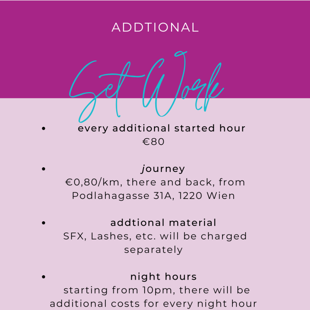 - additional material: SFX, lashes, etc. will be charged separately