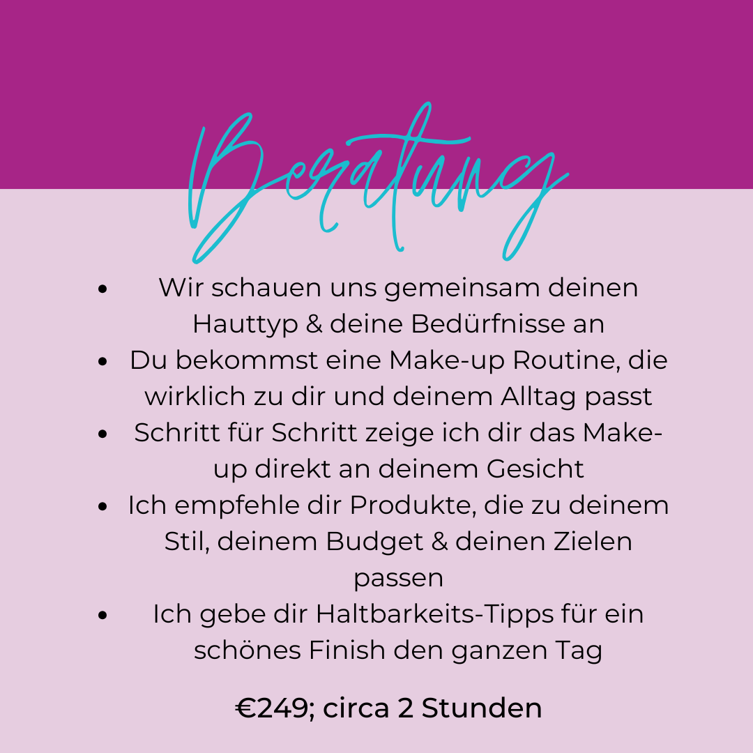In meinen Beratungen geht es nicht um Trends oder starre Regeln, sondern um dich: deinen Typ, deinen Stil, deinen Alltag und das, was dir wirklich steht. Ob du dir ein frisches Alltags-Make-up wünschst, einen eleganten Look für besondere Anlässe oder einfach mehr Sicherheit im Umgang mit deinen Produkten, wir finden gemeinsam deinen ganz persönlichen Look.
