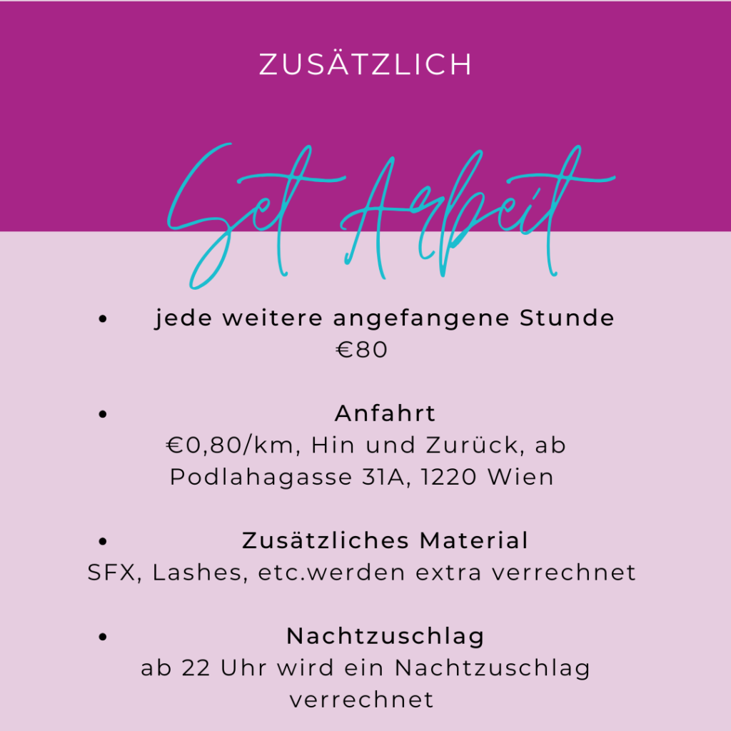 - Zusätzliches Material: SFX, Lashes, etc. werden extra verrechnet